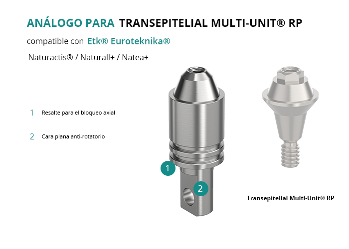 El análogo es una herramienta esencial para reproducir la geometría funcional del Transepitelial Multi-Unit® RP, facilitando tanto la confección de restauraciones tradicionales como digitales. Es compatible con implantes Etk® Euroteknika® de la plataforma Naturactis® / Naturall+ / Natea+, asegurando resultados óptimos en restauraciones protésicas sobre implantes.