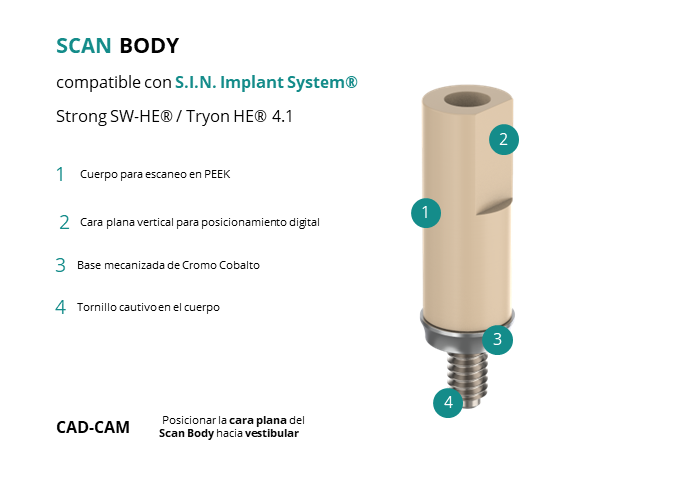 - CAD-CAM: Posicionar la cara plana del Scan Body hacia vestibular.