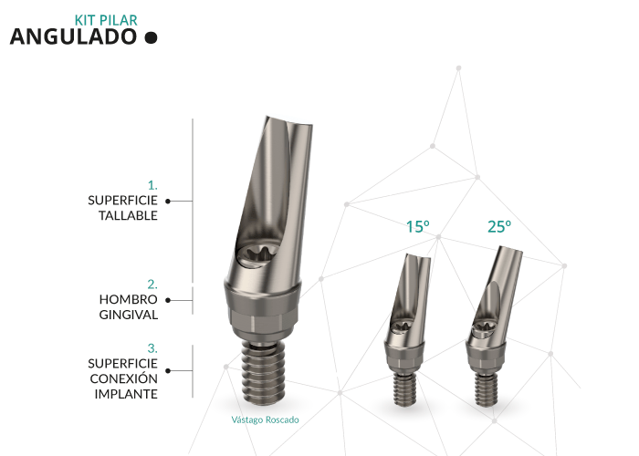 • Superficie tallable: el cuerpo del pilar se puede tallar dependiendo de la altura protésica que necesite la pieza. Existiendo dos angulaciones posibles de 15° y 25°.