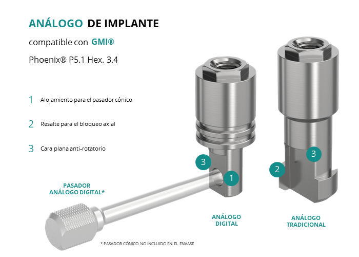 El análogo de GT-Medical compatible con la línea de implantes Phoenix® P5.1 Hex. 3.4 de la marca Gmi®, está fabricado en Acero Inoxidable, tiene un diámetro de 5.1mm, y replica con exactitud la conexión de este implante de Gmi®.