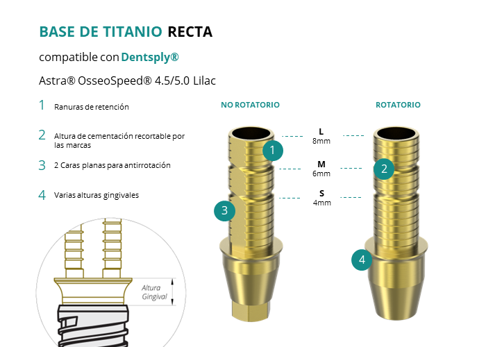 Las Ti-Base Rectas de GT-Medical son compatibles con los implantes Astra® OsseoSpeed® 4.5/5.0 Lilac de Dentsply®, permitiendo una conexión estable y duradera entre el implante y la prótesis. Están compuestas en su totalidad por Titanio de Grado 5 con un anodizado dorado para un acabado más estético. Poseen un tronco de cementación recortable a varias alturas, 2 caras planas para realizar la función antirotativa y un cuerpo gingival de varias alturas, dependiendo del tipo de conexión.