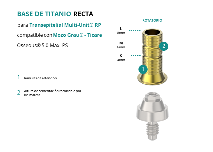 Las Ti-Base Rectas de GT-Medical son compatibles con los implantes Osseous® 5.0 Maxi PS de Mozo Grau® - Ticare, permitiendo una conexión estable y duradera entre el Transepitelial Multi-Unit® RP y la prótesis. Están compuestas en su totalidad por Titanio de Grado 5 con un anodizado dorado para un acabado más estético. Poseen un tronco de cementación ranurado y recortable a varias alturas.