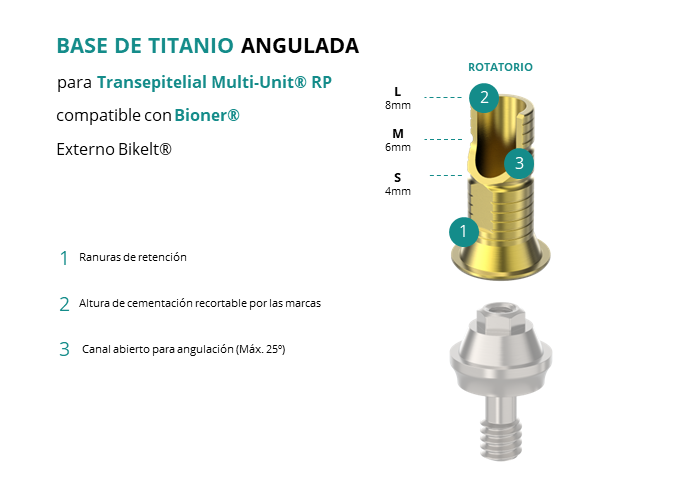 Las Ti-Base Anguladas de GT-Medical son compatibles con los implantes Externo Bikelt® de Bioner®, lo que asegura una conexión estable y duradera entre el Transepitelial Multi-Unit® RP y la prótesis, permitiendo además corregir angulaciones de hasta 25 grados. Están compuestas en su totalidad por Titanio de Grado 5 con un anodizado dorado para un acabado más estético. Poseen un tronco de cementación ranurado y recortable a varias alturas.