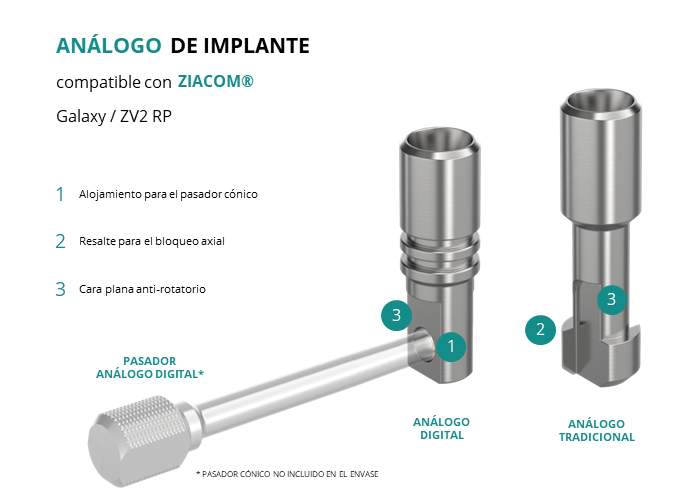 El análogo de GT-Medical compatible con la línea de implantes Galaxy / ZV2 RP de la marca Ziacom®, está fabricado en Acero Inoxidable, tiene un diámetro de 3.5mm, y replica con exactitud la conexión de este implante de Ziacom®.