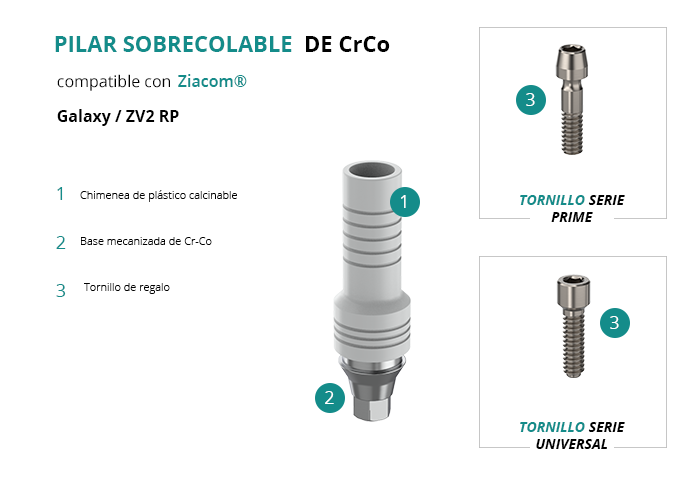 El Pilar Calcinable con Base de Cr-Co de GT-Medical es compatible con la línea de implantes Galaxy / ZV2 RP de la marca Ziacom®, proporciona una base sólida para la estructura protésica y garantiza un ajuste óptimo con el implante. Está formado por una base mecanizada de Cromo Cobalto y una chimenea de plástico calcinable.