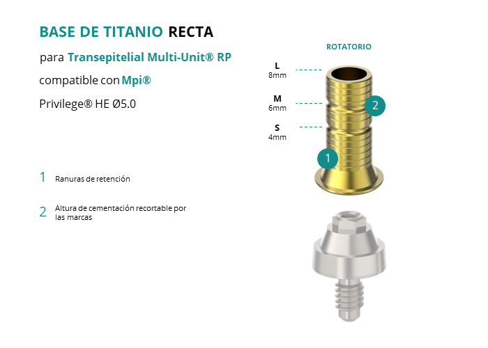 Las Ti-Base Rectas de GT-Medical son compatibles con los implantes Privilege® HE Ø5.0 de Mpi®, permitiendo una conexión estable y duradera entre el Transepitelial Multi-Unit® RP y la prótesis. Están compuestas en su totalidad por Titanio de Grado 5 con un anodizado dorado para un acabado más estético. Poseen un tronco de cementación ranurado y recortable a varias alturas.