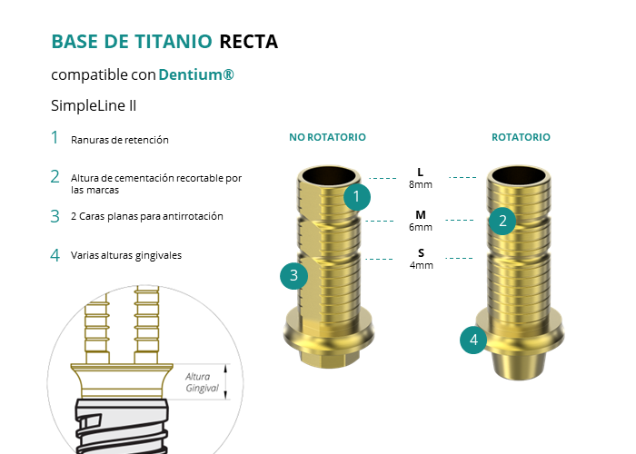 Las Ti-Base Rectas de GT-Medical son compatibles con los implantes SimpleLine II de Dentium®, permitiendo una conexión estable y duradera entre el implante y la prótesis. Están compuestas en su totalidad por Titanio de Grado 5 con un anodizado dorado para un acabado más estético. Poseen un tronco de cementación recortable a varias alturas, 2 caras planas para realizar la función antirotativa y un cuerpo gingival de varias alturas, dependiendo del tipo de conexión.