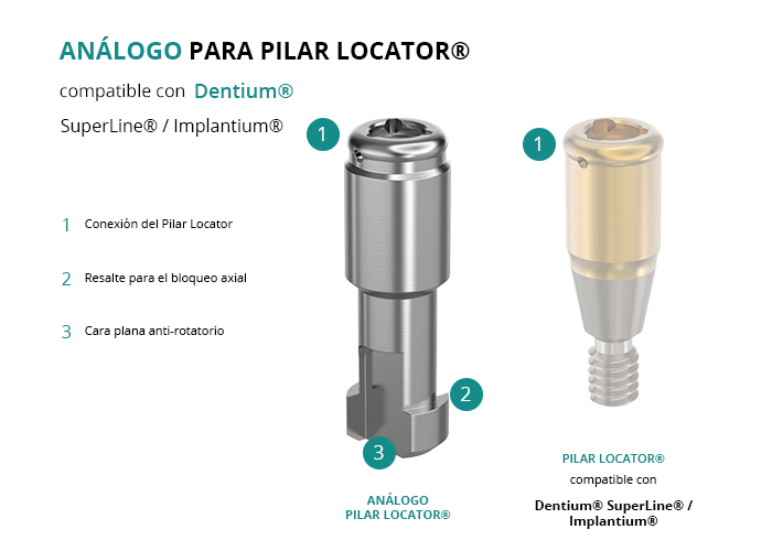 El análogo para Pilar Locator® es fundamental para crear el modelo de una restauración de sobredentadura removible que utilice pilares Locator® sobre implantes, como por ejemplo los de Dentium® de plataforma SuperLine® / Implantium®.