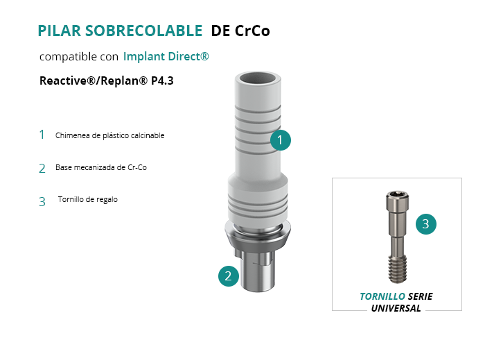Pilar Sobrecolable de CrCo compatible con Implant Direct® Reactive®/Replan® P4.3
