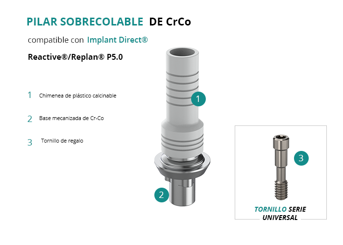 Pilar Sobrecolable de CrCo compatible con Implant Direct® Reactive®/Replan® P5.0