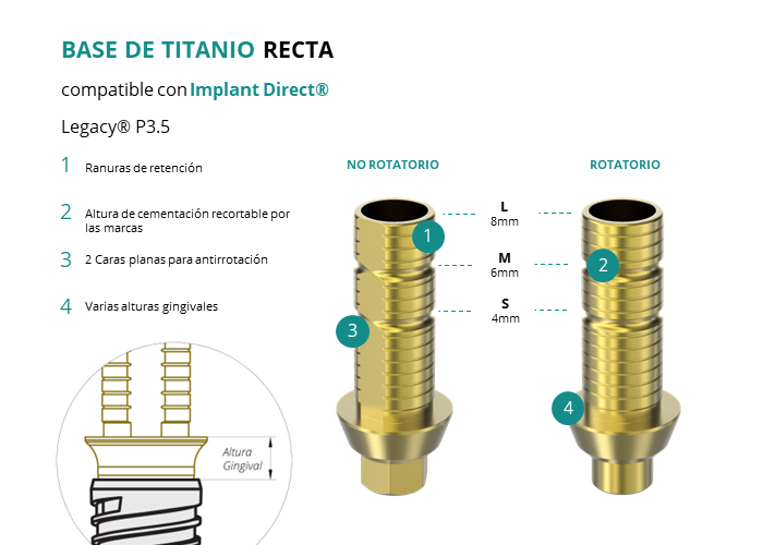 Las Ti-Base Rectas de GT-Medical son compatibles con los implantes Legacy® P3.5 de Implant Direct®, permitiendo una conexión estable y duradera entre el implante y la prótesis. Están compuestas en su totalidad por Titanio de Grado 5 con un anodizado dorado para un acabado más estético. Poseen un tronco de cementación recortable a varias alturas, 2 caras planas para realizar la función antirotativa y un cuerpo gingival de varias alturas, dependiendo del tipo de conexión.
