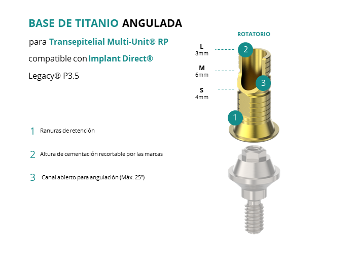 Las Ti-Base Anguladas de GT-Medical son compatibles con los implantes Legacy® P3.5 de Implant Direct®, lo que asegura una conexión estable y duradera entre el Transepitelial Multi-Unit® RP y la prótesis, permitiendo además corregir angulaciones de hasta 25 grados. Están compuestas en su totalidad por Titanio de Grado 5 con un anodizado dorado para un acabado más estético. Poseen un tronco de cementación ranurado y recortable a varias alturas.