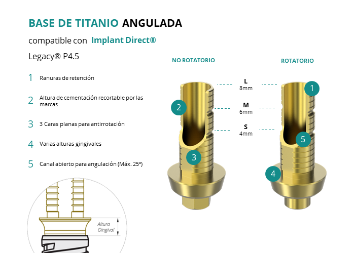 Las Ti-Base Anguladas de GT-Medical son compatibles con los implantes Legacy® P4.5 de Implant Direct®, facilitando una conexión estable y duradera entre el implante y la prótesis, y permitiendo corregir angulaciones de hasta 25 grados. Están compuestas en su totalidad por Titanio de Grado 5 con un anodizado dorado para un acabado más estético. Poseen un tronco de cementación recortable a varias alturas con canal abierto para permitir angulación, 3 caras planas para realizar la función antirotativa y un cuerpo gingival de varias alturas, dependiendo del tipo de conexión.