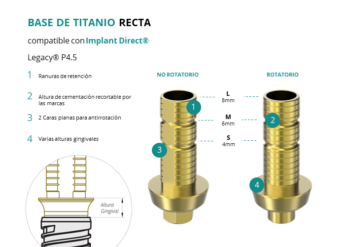 Las Ti-Base Rectas de GT-Medical son compatibles con los implantes Legacy® P4.5 de Implant Direct®, permitiendo una conexión estable y duradera entre el implante y la prótesis. Están compuestas en su totalidad por Titanio de Grado 5 con un anodizado dorado para un acabado más estético. Poseen un tronco de cementación recortable a varias alturas, 2 caras planas para realizar la función antirotativa y un cuerpo gingival de varias alturas, dependiendo del tipo de conexión.