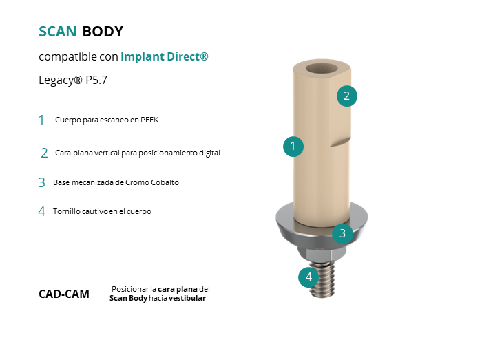 - CAD-CAM: Posicionar la cara plana del Scan Body hacia vestibular.
