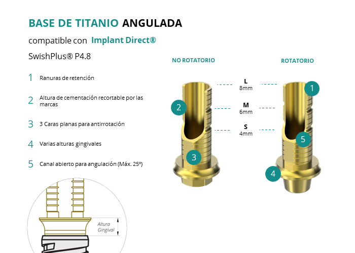 Las Ti-Base Anguladas de GT-Medical son compatibles con los implantes SwishPlus® P4.8 de Implant Direct®, facilitando una conexión estable y duradera entre el implante y la prótesis, y permitiendo corregir angulaciones de hasta 25 grados. Están compuestas en su totalidad por Titanio de Grado 5 con un anodizado dorado para un acabado más estético. Poseen un tronco de cementación recortable a varias alturas con canal abierto para permitir angulación, 3 caras planas para realizar la función antirotativa y un cuerpo gingival de varias alturas, dependiendo del tipo de conexión.