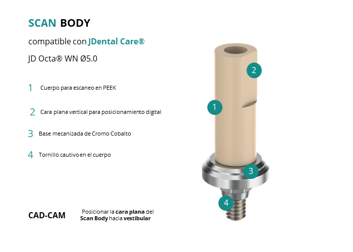 - CAD-CAM: Posicionar la cara plana del Scan Body hacia vestibular.