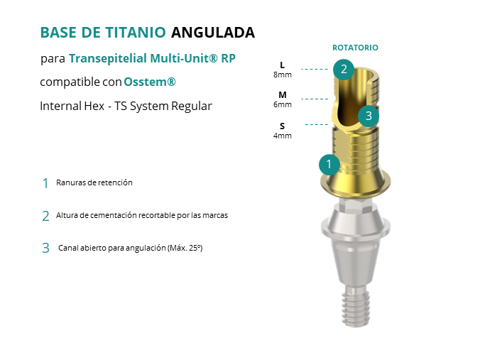 Las Ti-Base Anguladas de GT-Medical son compatibles con los implantes Internal Hex - TS System Regular de Osstem®, lo que asegura una conexión estable y duradera entre el Transepitelial Multi-Unit® RP y la prótesis, permitiendo además corregir angulaciones de hasta 25 grados. Están compuestas en su totalidad por Titanio de Grado 5 con un anodizado dorado para un acabado más estético. Poseen un tronco de cementación ranurado y recortable a varias alturas.