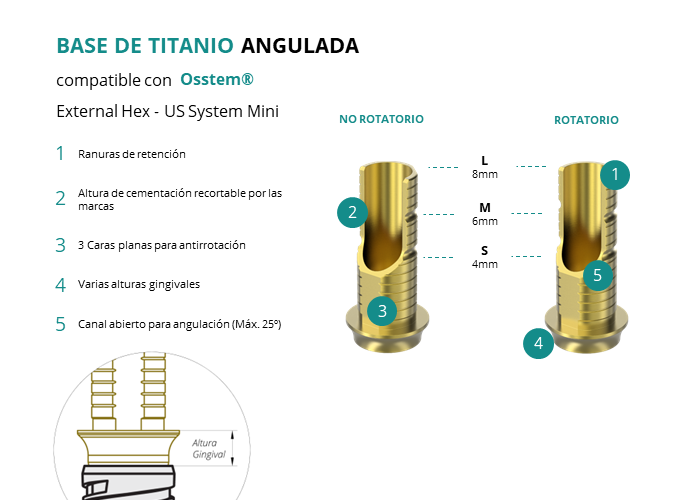 Las Ti-Base Anguladas de GT-Medical son compatibles con los implantes External Hex - US System Mini de Osstem®, facilitando una conexión estable y duradera entre el implante y la prótesis, y permitiendo corregir angulaciones de hasta 25 grados. Están compuestas en su totalidad por Titanio de Grado 5 con un anodizado dorado para un acabado más estético. Poseen un tronco de cementación recortable a varias alturas con canal abierto para permitir angulación, 3 caras planas para realizar la función antirotativa y un cuerpo gingival de varias alturas, dependiendo del tipo de conexión.