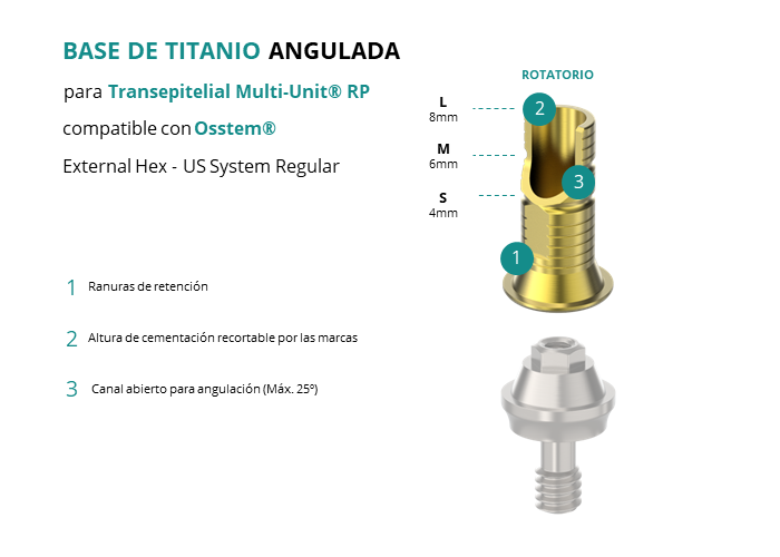 Las Ti-Base Anguladas de GT-Medical son compatibles con los implantes External Hex - US System Regular de Osstem®, lo que asegura una conexión estable y duradera entre el Transepitelial Multi-Unit® RP y la prótesis, permitiendo además corregir angulaciones de hasta 25 grados. Están compuestas en su totalidad por Titanio de Grado 5 con un anodizado dorado para un acabado más estético. Poseen un tronco de cementación ranurado y recortable a varias alturas.