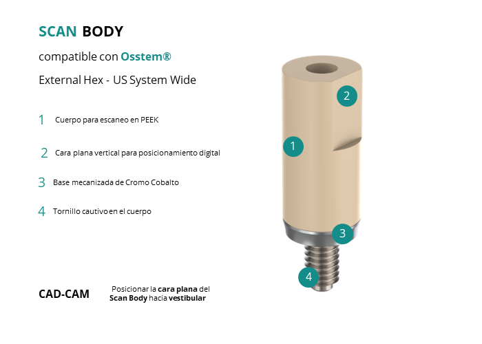- CAD-CAM: Posicionar la cara plana del Scan Body hacia vestibular.