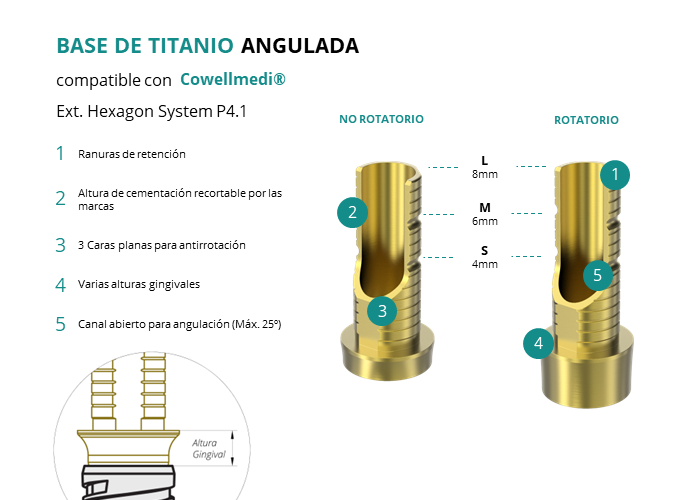 Las Ti-Base Anguladas de GT-Medical son compatibles con los implantes Ext. Hexagon System P4.1 de Cowellmedi®, facilitando una conexión estable y duradera entre el implante y la prótesis, y permitiendo corregir angulaciones de hasta 25 grados. Están compuestas en su totalidad por Titanio de Grado 5 con un anodizado dorado para un acabado más estético. Poseen un tronco de cementación recortable a varias alturas con canal abierto para permitir angulación, 3 caras planas para realizar la función antirotativa y un cuerpo gingival de varias alturas, dependiendo del tipo de conexión.