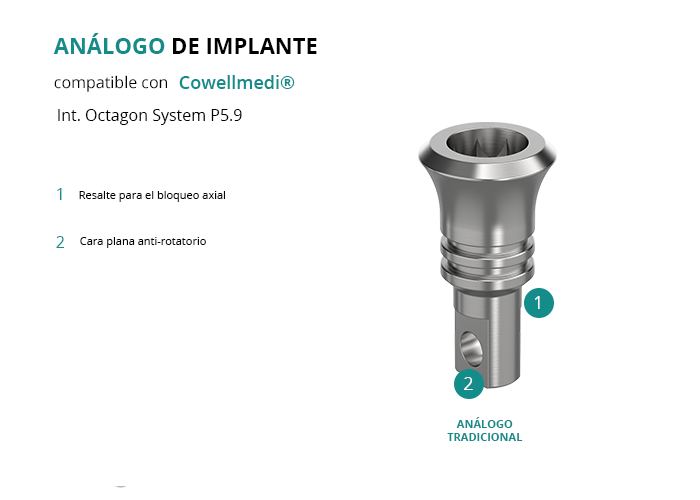 El análogo de GT-Medical compatible con la línea de implantes Int. Octagon System P5.9 de la marca Cowellmedi®, está fabricado en Acero Inoxidable, tiene un diámetro de 5.9mm, y replica con exactitud la conexión de este implante de Cowellmedi®.