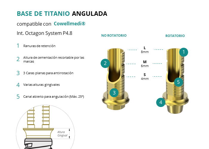 Las Ti-Base Anguladas de GT-Medical son compatibles con los implantes Int. Octagon System P4.8 de Cowellmedi®, facilitando una conexión estable y duradera entre el implante y la prótesis, y permitiendo corregir angulaciones de hasta 25 grados. Están compuestas en su totalidad por Titanio de Grado 5 con un anodizado dorado para un acabado más estético. Poseen un tronco de cementación recortable a varias alturas con canal abierto para permitir angulación, 3 caras planas para realizar la función antirotativa y un cuerpo gingival de varias alturas, dependiendo del tipo de conexión.