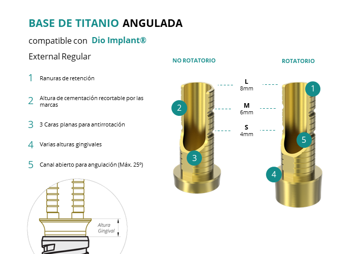 Las Ti-Base Anguladas de GT-Medical son compatibles con los implantes External Regular de Dio Implant®, facilitando una conexión estable y duradera entre el implante y la prótesis, y permitiendo corregir angulaciones de hasta 25 grados. Están compuestas en su totalidad por Titanio de Grado 5 con un anodizado dorado para un acabado más estético. Poseen un tronco de cementación recortable a varias alturas con canal abierto para permitir angulación, 3 caras planas para realizar la función antirotativa y un cuerpo gingival de varias alturas, dependiendo del tipo de conexión.
