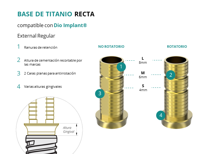 Las Ti-Base Rectas de GT-Medical son compatibles con los implantes External Regular de Dio Implant®, permitiendo una conexión estable y duradera entre el implante y la prótesis. Están compuestas en su totalidad por Titanio de Grado 5 con un anodizado dorado para un acabado más estético. Poseen un tronco de cementación recortable a varias alturas, 2 caras planas para realizar la función antirotativa y un cuerpo gingival de varias alturas, dependiendo del tipo de conexión.