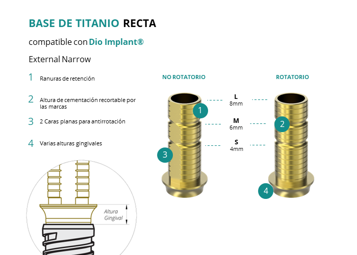 Las Ti-Base Rectas de GT-Medical son compatibles con los implantes External Narrow de Dio Implant®, permitiendo una conexión estable y duradera entre el implante y la prótesis. Están compuestas en su totalidad por Titanio de Grado 5 con un anodizado dorado para un acabado más estético. Poseen un tronco de cementación recortable a varias alturas, 2 caras planas para realizar la función antirotativa y un cuerpo gingival de varias alturas, dependiendo del tipo de conexión.