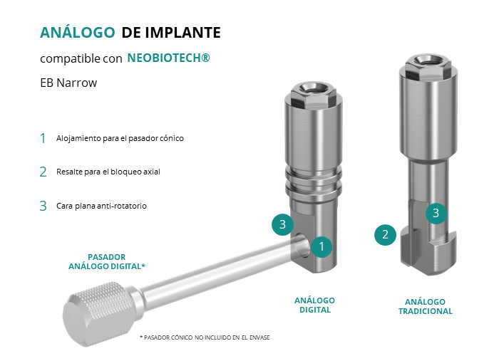 El análogo de GT-Medical compatible con la línea de implantes EB Narrow de la marca Neobiotech®, está fabricado en Acero Inoxidable, tiene un diámetro de 3.5mm, y replica con exactitud la conexión de este implante de Neobiotech®.