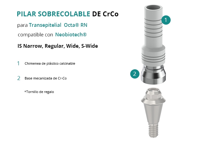 Pilar Sobrecolable de CrCo para Transepitelial Octa® RN compatible con Neobiotech® IS Narrow, Regular, Wide, S-Wide