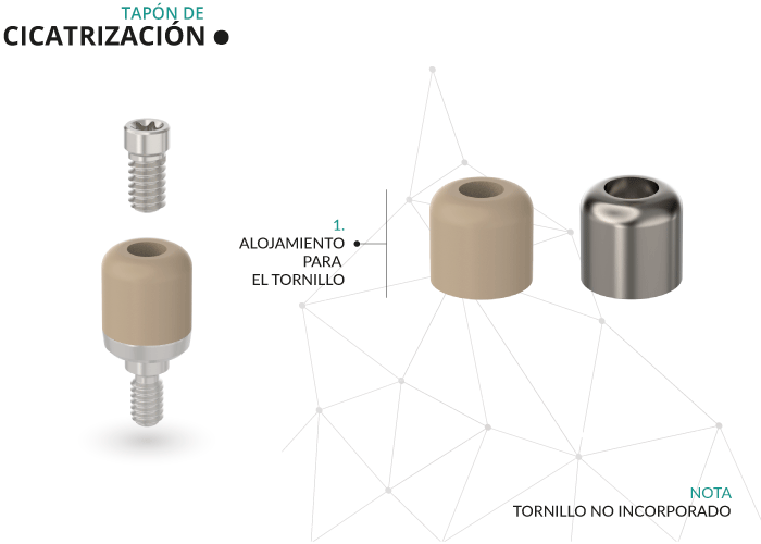 Todos los tapones de cicatrización están provistos de un alojamiento para el tornillo de fijación con el implante.