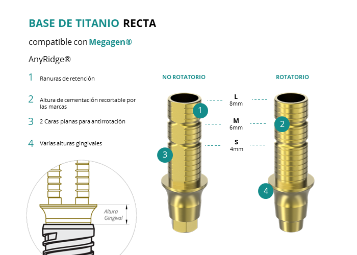 Las Ti-Base Rectas de GT-Medical son compatibles con los implantes AnyRidge® de Megagen®, permitiendo una conexión estable y duradera entre el implante y la prótesis. Están compuestas en su totalidad por Titanio de Grado 5 con un anodizado dorado para un acabado más estético. Poseen un tronco de cementación recortable a varias alturas, 2 caras planas para realizar la función antirotativa y un cuerpo gingival de varias alturas, dependiendo del tipo de conexión.