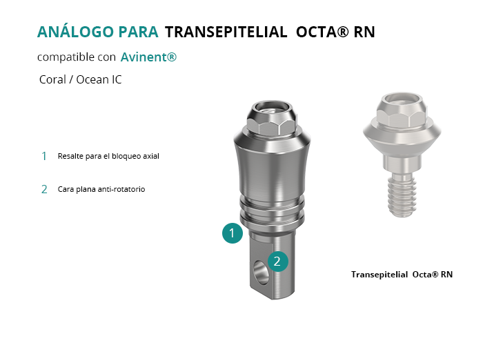 El análogo es una herramienta esencial para reproducir la geometría funcional del Transepitelial Octa® RN, facilitando tanto la confección de restauraciones tradicionales como digitales. Es compatible con implantes Avinent® de la plataforma Coral / Ocean IC, asegurando resultados óptimos en restauraciones protésicas sobre implantes.