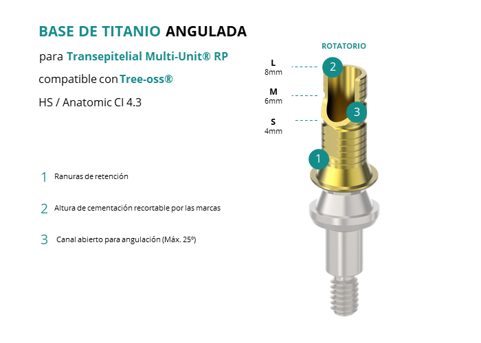 Las Ti-Base Anguladas de GT-Medical son compatibles con los implantes HS / Anatomic CI 4.3 de Tree-oss®, lo que asegura una conexión estable y duradera entre el Transepitelial Multi-Unit® RP y la prótesis, permitiendo además corregir angulaciones de hasta 25 grados. Están compuestas en su totalidad por Titanio de Grado 5 con un anodizado dorado para un acabado más estético. Poseen un tronco de cementación ranurado y recortable a varias alturas.