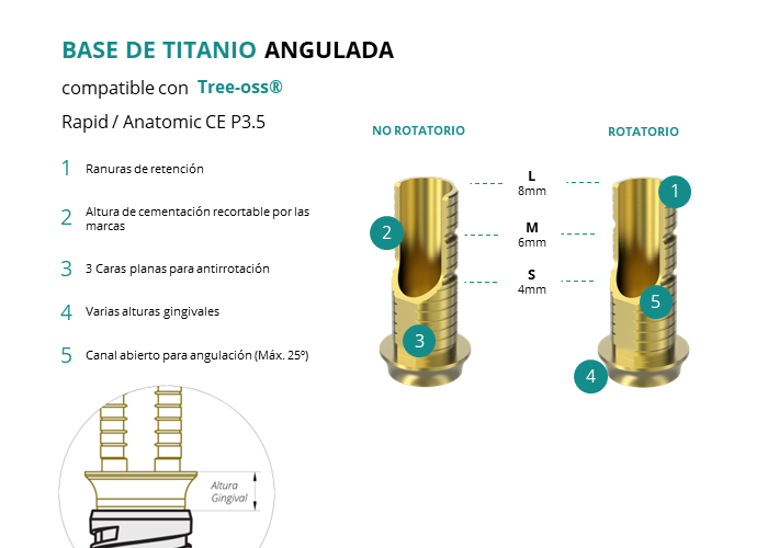 Las Ti-Base Anguladas de GT-Medical son compatibles con los implantes Rapid / Anatomic CE P3.5 de Tree-oss®, facilitando una conexión estable y duradera entre el implante y la prótesis, y permitiendo corregir angulaciones de hasta 25 grados. Están compuestas en su totalidad por Titanio de Grado 5 con un anodizado dorado para un acabado más estético. Poseen un tronco de cementación recortable a varias alturas con canal abierto para permitir angulación, 3 caras planas para realizar la función antirotativa y un cuerpo gingival de varias alturas, dependiendo del tipo de conexión.