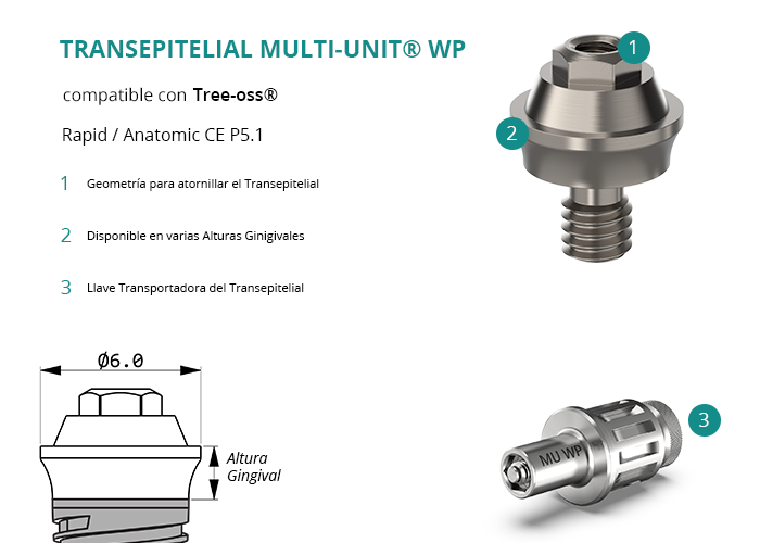 El Transepitelial Multi-Unit® WP de GT-Medical es compatible con los implantes Rapid / Anatomic CE P5.1 de Tree-oss®, proporcionando una conexión duradera y estable para restauraciones múltiples. Tiene un diámetro de 6.0mm, y está fabricado en Titanio de Grado 5, garantiza una alta resistencia, biocompatibilidad y durabilidad en las restauraciones sobre implantes. Su diseño incluye varias alturas gingivales, lo que facilita la adaptación en diferentes perfiles de tejidos blandos y garantiza una estética óptima.