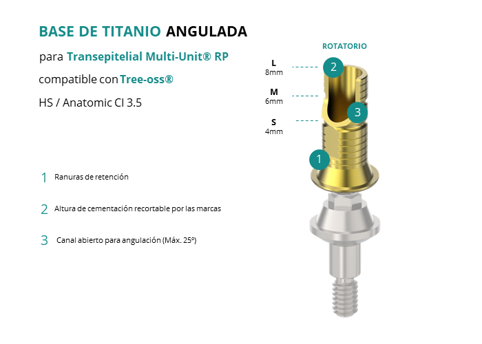 Las Ti-Base Anguladas de GT-Medical son compatibles con los implantes HS / Anatomic CI 3.5 de Tree-oss®, lo que asegura una conexión estable y duradera entre el Transepitelial Multi-Unit® RP y la prótesis, permitiendo además corregir angulaciones de hasta 25 grados. Están compuestas en su totalidad por Titanio de Grado 5 con un anodizado dorado para un acabado más estético. Poseen un tronco de cementación ranurado y recortable a varias alturas.