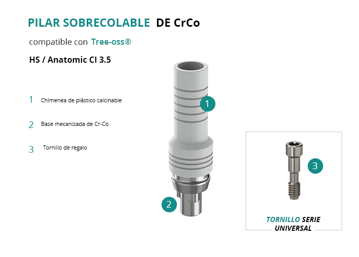 El Pilar Calcinable con Base de Cr-Co de GT-Medical es compatible con la línea de implantes HS / Anatomic CI 3.5 de la marca Tree-oss®, proporciona una base sólida para la estructura protésica y garantiza un ajuste óptimo con el implante. Está formado por una base mecanizada de Cromo Cobalto y una chimenea de plástico calcinable.