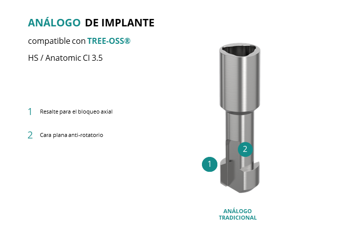 El análogo de GT-Medical compatible con la línea de implantes HS / Anatomic CI 3.5 de la marca Tree-oss®, está fabricado en Acero Inoxidable, tiene un diámetro de 3.5mm, y replica con exactitud la conexión de este implante de Tree-oss®.