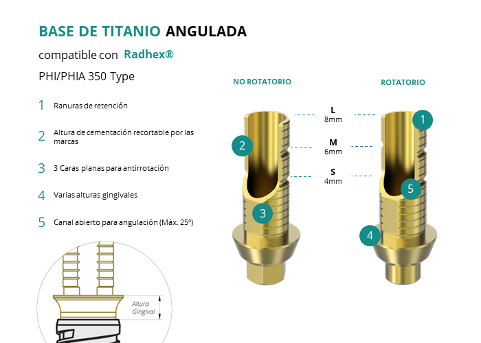 Las Ti-Base Anguladas de GT-Medical son compatibles con los implantes PHI/PHIA 350 Type de Radhex®, facilitando una conexión estable y duradera entre el implante y la prótesis, y permitiendo corregir angulaciones de hasta 25 grados. Están compuestas en su totalidad por Titanio de Grado 5 con un anodizado dorado para un acabado más estético. Poseen un tronco de cementación recortable a varias alturas con canal abierto para permitir angulación, 3 caras planas para realizar la función antirotativa y un cuerpo gingival de varias alturas, dependiendo del tipo de conexión.