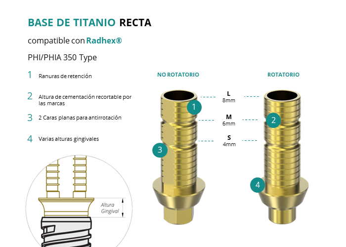 Las Ti-Base Rectas de GT-Medical son compatibles con los implantes PHI/PHIA 350 Type de Radhex®, permitiendo una conexión estable y duradera entre el implante y la prótesis. Están compuestas en su totalidad por Titanio de Grado 5 con un anodizado dorado para un acabado más estético. Poseen un tronco de cementación recortable a varias alturas, 2 caras planas para realizar la función antirotativa y un cuerpo gingival de varias alturas, dependiendo del tipo de conexión.