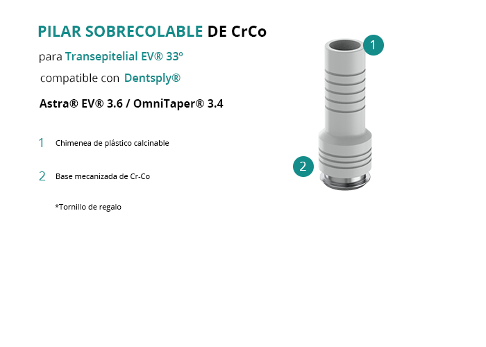 El Pilar Calcinable con Base de Cr-Co de GT-Medical es compatible con la línea de implantes Astra® EV® 3.6 / OmniTaper® 3.4 de la marca Dentsply®, proporciona una base sólida para la estructura protésica y garantiza un ajuste óptimo con el Transepitelial EV® 33º. Está formado por una base mecanizada de Cromo Cobalto y una chimenea de plástico calcinable.
