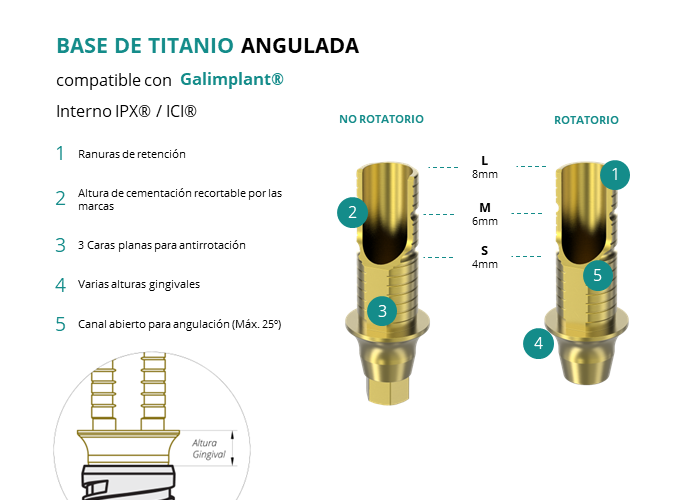 Las Ti-Base Anguladas de GT-Medical son compatibles con los implantes Interno IPX® / ICI® de Galimplant®, facilitando una conexión estable y duradera entre el implante y la prótesis, y permitiendo corregir angulaciones de hasta 25 grados. Están compuestas en su totalidad por Titanio de Grado 5 con un anodizado dorado para un acabado más estético. Poseen un tronco de cementación recortable a varias alturas con canal abierto para permitir angulación, 3 caras planas para realizar la función antirotativa y un cuerpo gingival de varias alturas, dependiendo del tipo de conexión.