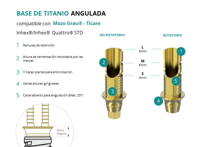 Las Ti-Base Anguladas de GT-Medical son compatibles con los implantes Inhex®/Inhex® Quattro® STD de Mozo Grau® - Ticare, facilitando una conexión estable y duradera entre el implante y la prótesis, y permitiendo corregir angulaciones de hasta 25 grados. Están compuestas en su totalidad por Titanio de Grado 5 con un anodizado dorado para un acabado más estético. Poseen un tronco de cementación recortable a varias alturas con canal abierto para permitir angulación, 3 caras planas para realizar la función antirotativa y un cuerpo gingival de varias alturas, dependiendo del tipo de conexión.